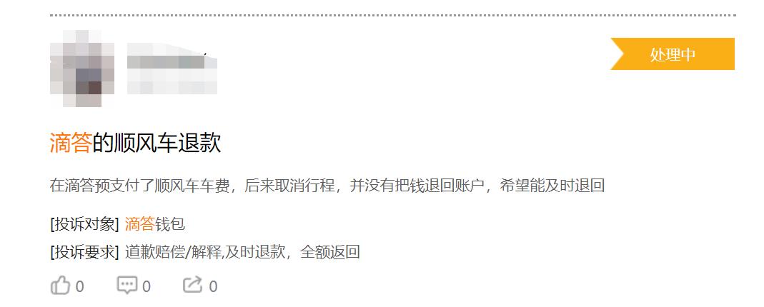 来源 / 黑猫投诉一位乘客称:“在滴答预支付了顺风车车费,但是后来取消订单,APP也没有退钱。”