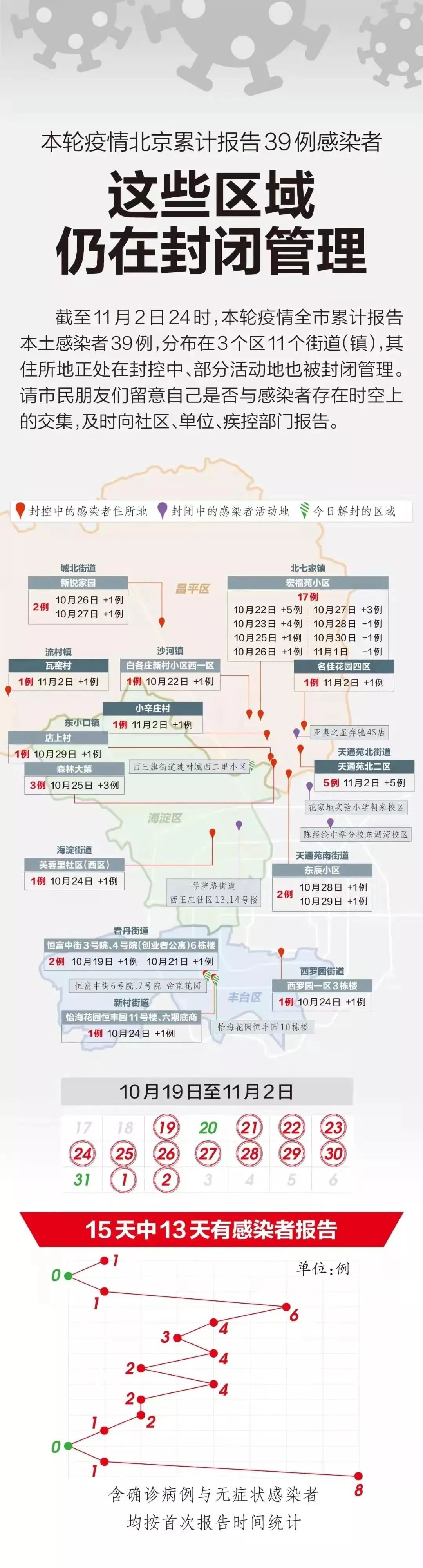 【北京新增9例确诊病例,包含一家五口】11月2日0时至24时,北京新增8例本土确诊病例(其中病例1至4昨日已通报)和1例无症状感染者转确诊病例,包含昌平区一家五口。截至11月2日24时,北京本轮疫情累计报告本土感染者39例,分布在3个区11个街道(镇)。(详情)【北京本轮疫情以家庭传播为主】北京本轮疫情为德尔塔变异株,传染性强,传播途径主要以家庭接触传播为主,其次为棋牌聚集传播,两种途径约占70%,已有多个家庭共同居住人员全部感染。铁路部门暂停发售23个地区123个车站至北京地区的车站车票。