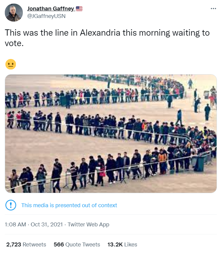 尽管这张照片的实际场景与@JGaffneyUSN所说的并不相符,但弗吉尼亚州民众在此次州长选举中的确展现了空前的积极性。