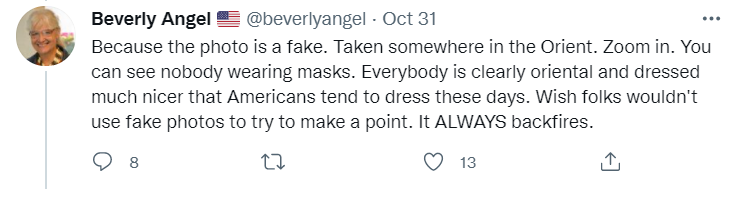 也有人一针见血地指出图片是假的:放大图片,你会发现没有人戴着口罩。