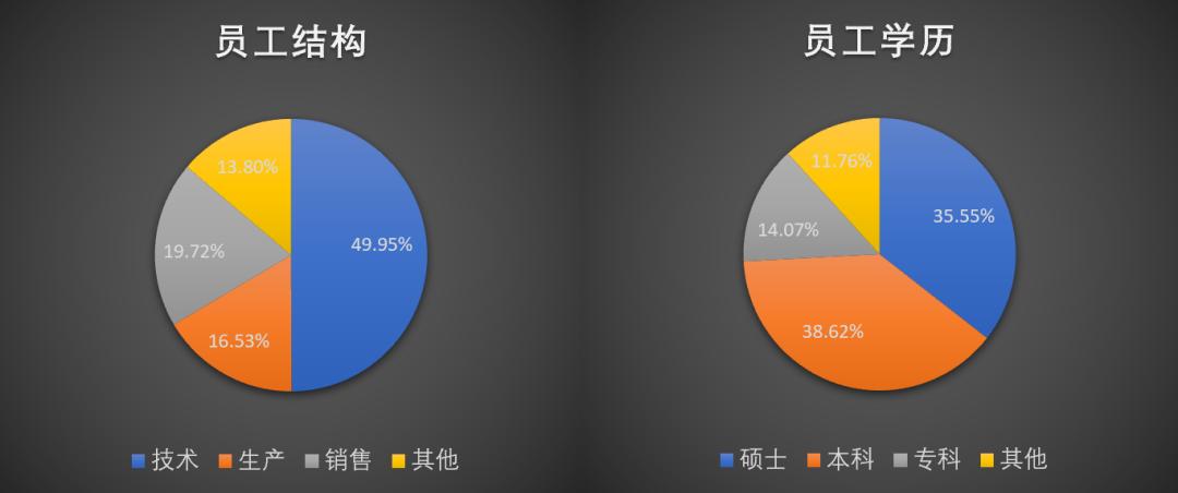 2020年,韦尔研发人员共1644人,占员工总人数的比例达到了49.95%,公司员工中硕士及以上学历占比达到35.55%,本科学历占比 38.62%,低于本科学历的员工仅占25.83%的份额。