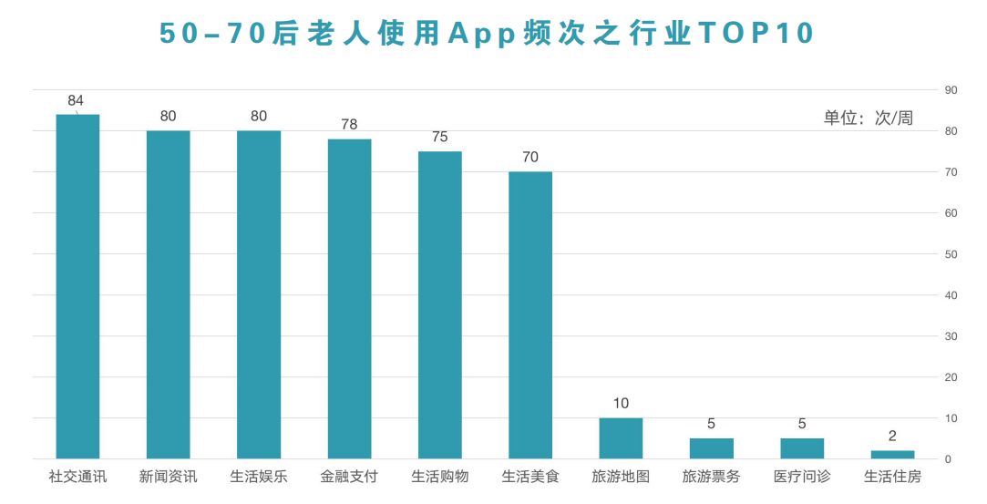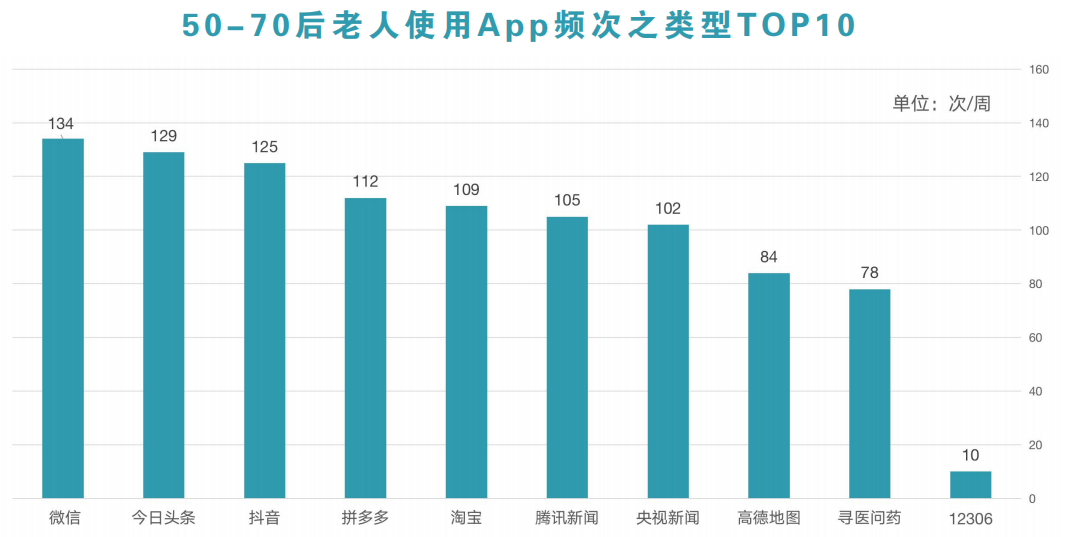 微信、今日头条、抖音等三种APP成为了50-70后中老年使用频率最高的APP。这同时也意味着中老年群体对于社交通讯、娱乐资讯有强烈的需求,主流APP的适老化改造刻不容缓。