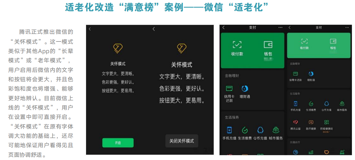 当然,在智能化和老龄化交织的这一过程中,还有很多长辈没有享受到数字技术带来的便利,在使用过程中遇到了各种阻碍。比如,老人想进一趟超市,却被告知扫码通行;老人不知如何在线挂号,只能求助旁人等等。正是基于这种原因,工业和信息化部印发《互联网应用适老化及无障碍改造专项行动方案》,并列出APP适老化改造名单,决定自2021年1月起,在全国范围内组织开展为期一年的互联网应用适老化及无障碍改造专项行动。如今行动即将进入尾声,这也是《移动互联网应用(APP)适老化改造调研报告》发布的背景。