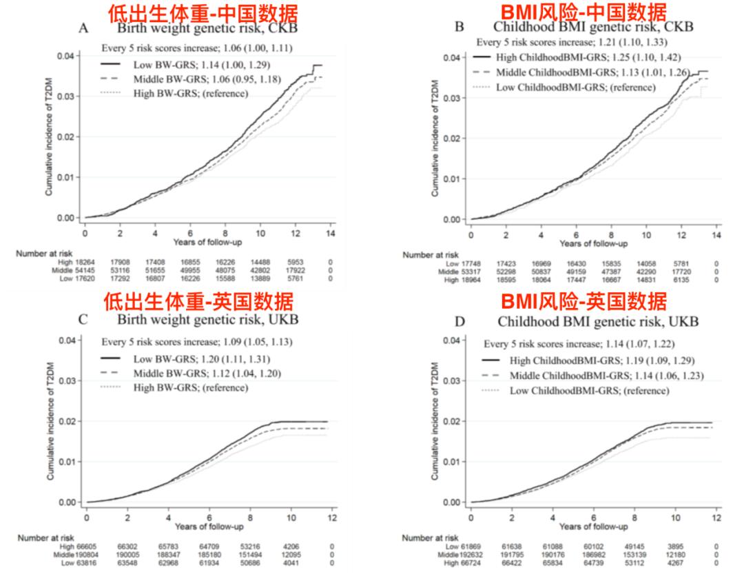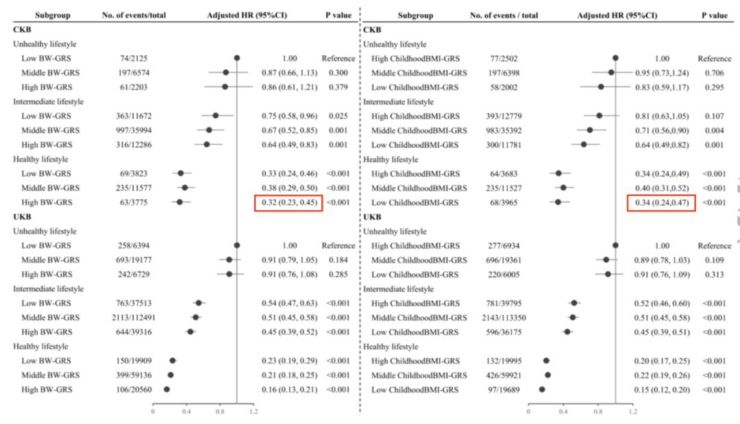 结果显示,低出生体重儿童和遗传预测BMI较高的儿童的确具有“先天不足”的问题,其2型糖尿病的风险会比其他人要高出一截。不过,更高的风险换句话说就是更大的进步空间!在CKB的糖尿病高遗传风险人群中,与不健康生活方式相比,生活方式健康的参与者的2型糖尿病的风险降低了 68%(HR 0.32,95%CI 0.22-0.47)。同样,在UKB的糖尿病高遗传风险人群中,相应的风险甚至可以降低77%(HR 0.23,95%CI 0.19,0.28)。