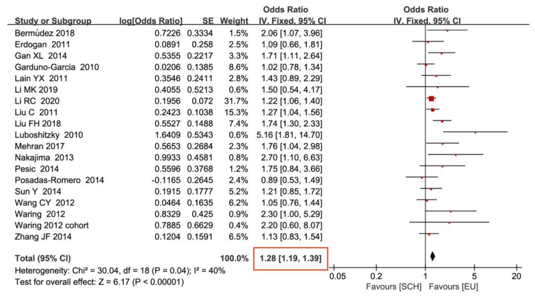 图 2.1 研究发表于Endocr J这项来自西安交通大学第一附属医院的系统综述和荟萃分析共纳入了18篇文章、19项研究的数据,共涉及79727名参与者,比较了患有亚临床甲减人群和甲状腺功能正常参与者的代谢综合征及其成分的风险。代谢综合征的各种成分包括中心性肥胖、高血压、甘油三酯水平高、高密度脂蛋白胆固醇水平低和高血糖。