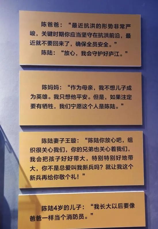 陈陆纪念馆共分五个板块,收集着他生前的语录、照片、影像资料和个人物品,分别从抗洪抢险、家风传承、坚守基层、服务百姓等方面回顾他短暂而璀璨的一生。