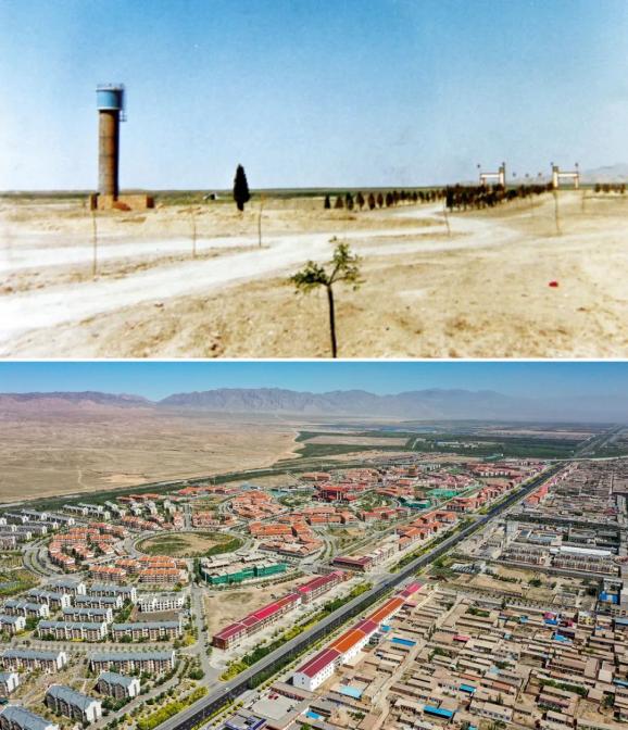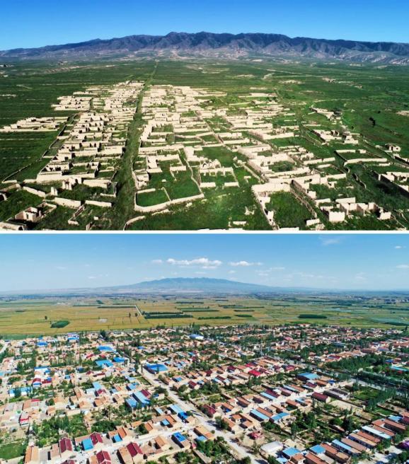 这是一张拼版照片,上图为:经过多年的生态修复,宁夏吴忠市红寺堡区新庄集乡的移民旧址已逐渐被绿色覆盖;下图为:戈壁荒滩上建起的红寺堡移民新村(2018年9月8日摄,无人机照片)。3