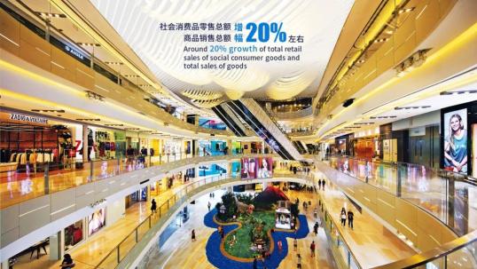 三是消费潜力不断释放。聚焦国际消费中心城市建设,大力拓展消费新业态新模式,积极促进会商旅文体联动,前三季度社会消费品零售总额、商品销售总额增幅均达到20%左右。