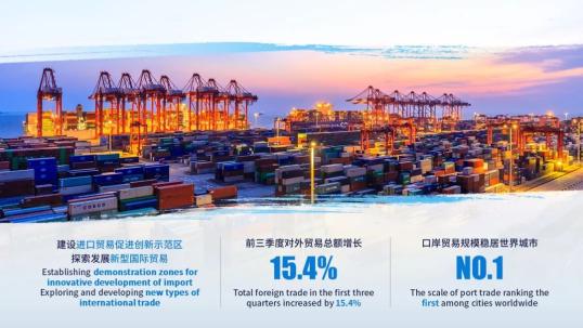 一是贸易联通世界的核心枢纽不断强化。建设进口贸易促进创新示范区,探索发展新型国际贸易,前三季度对外贸易总额增长15.4%,口岸贸易规模稳居世界城市首位。
