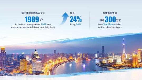 三是市场主体投资兴业的重要平台更加突出。前三季度,全市日均新设企业1989户、增长24%,各类市场主体累计超过300万家,上海这片创业与投资的热土温度始终不减。