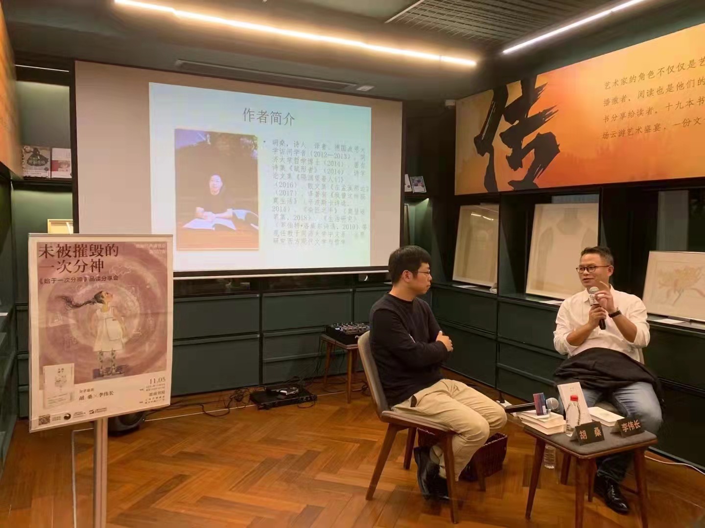 11月5日晚,胡桑(左)与青年批评家李伟长(右)做客思南书局,就《始于一次分神》与读者展开一场品读分享会。主办方供图
