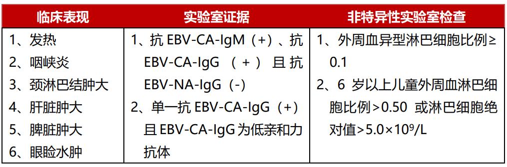 原发性EB病毒感染(患者第一次感染EB病毒),可导致传染性单核细胞增多征,其典型临床“三联征”为发热、咽峡炎和颈部淋巴结肿大,可伴有肝脾肿大,典型外周血特征为淋巴细胞和异型淋巴细胞增加。