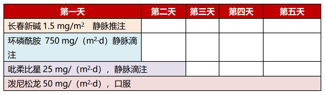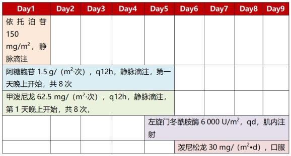 可根据患儿的情况酌情加用每周1次的依托泊苷,100~150 mg/(m2·d)表3.二线方案:(ESCAP方案)