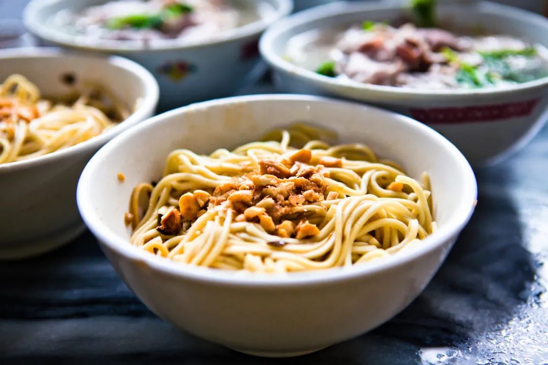 塔脚干面最独特的地方在于使用陈醋来拌面,口感清爽,再加入提前用蒜末和葱花煎炸的香油,最后撒上非常具备标识性的炸花生末,一碗塔脚干面就制作完成了。搅拌均匀,尝上一口,香油与花生末大大提升了面条本身的风味,再结合陈醋酸爽的口感,令人欲罢不能。
