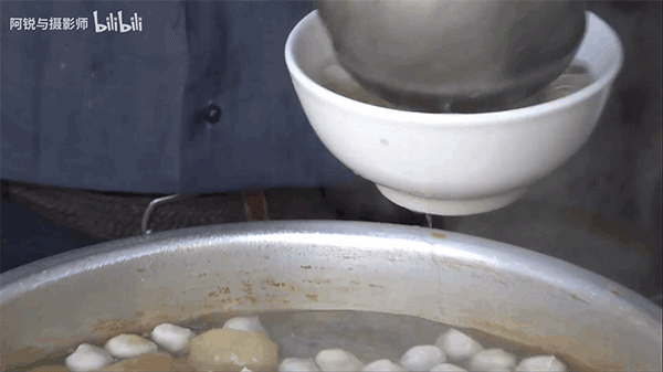 炸猪皮肉丸汤 | 动图截自B站UP主阿锐与摄影师潮汕干面上餐速度飞快,或许是师傅已经熟能生巧,又或许是考虑到“快速、顶饱”这些需求。而不论怎样,一碗干面,搭配上一碗鲜汤,就能在短时间内带给人平凡而又幸福的满足。