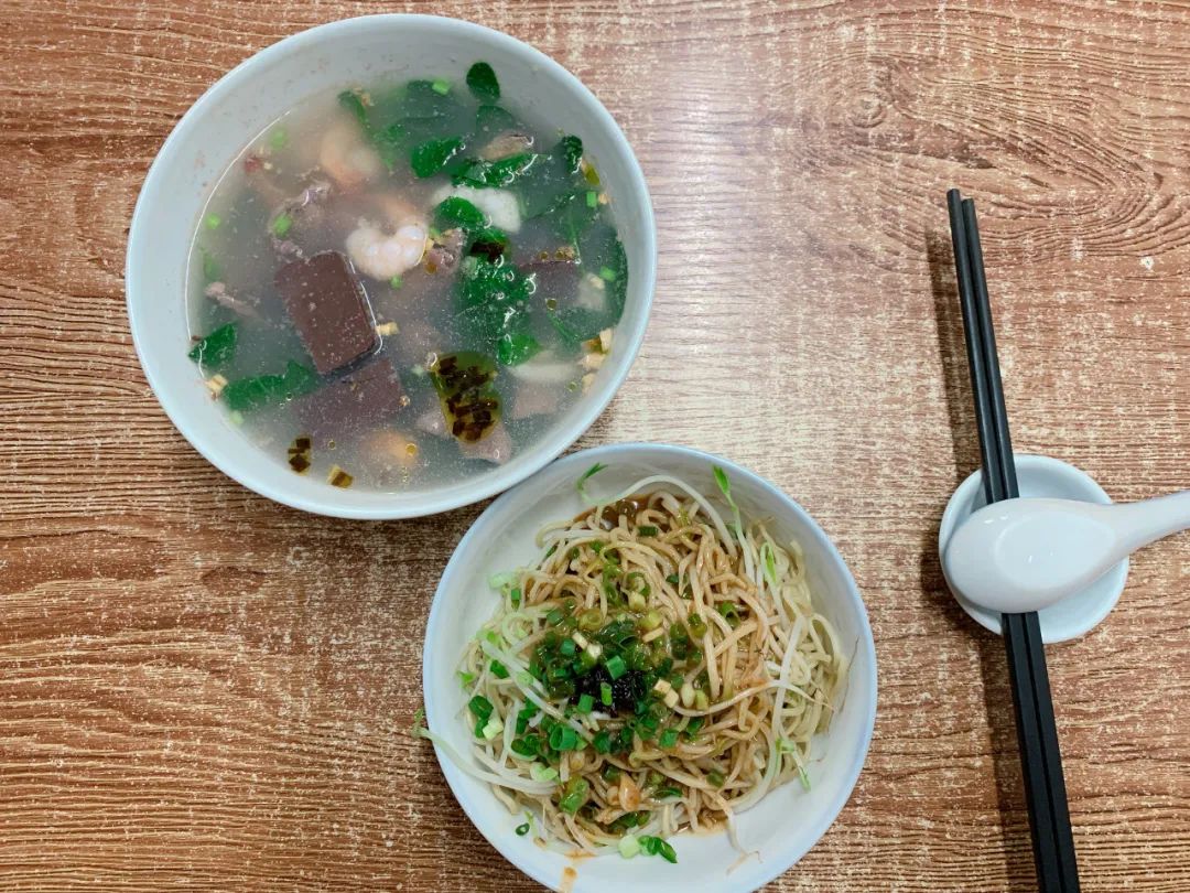 潮汕干面有点类似于葱油拌面、热干面,用的是新鲜湿润的碱水面,下水焯熟后迅速捞干,佐以猪油、葱花及特制酱料迅速拌匀,通常还会搭配上一碗时令海鲜加猪杂煮出来的高汤。