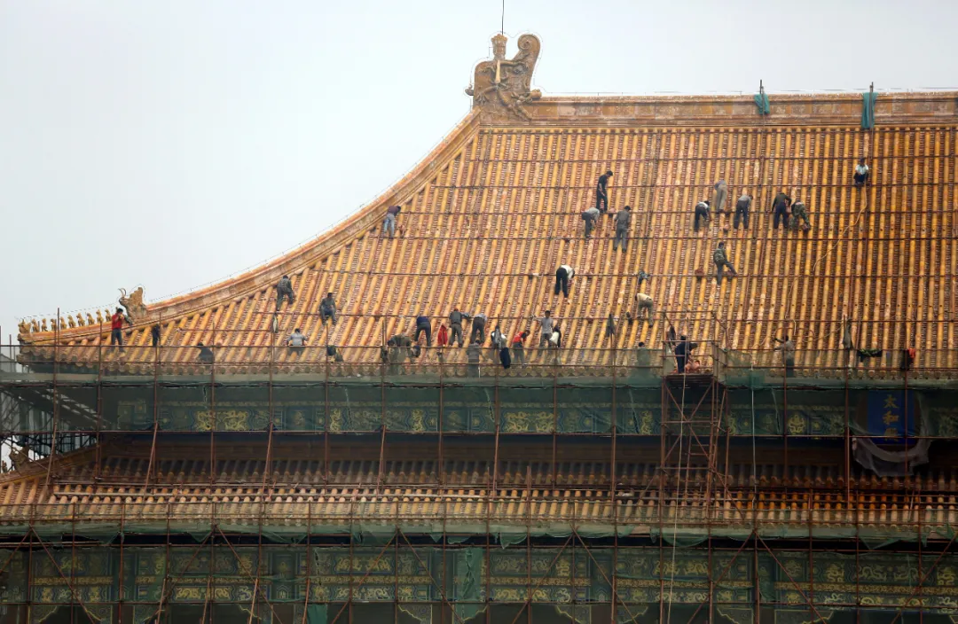 工人在木架间穿梭忙碌,搭木、瓦瓦、上漆、彩绘,往复不断,2008年7月,经过两年修缮,太和殿大修正式完工。