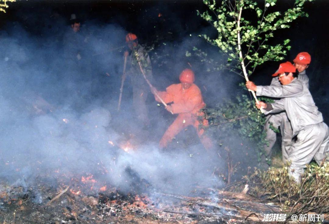 90年代大兴安岭林场工人扑林打火。/ 图虫创意有人称这场大火为“天火”,因为他们从未见过“一团一团的烈焰,呼啸着从天降下”。