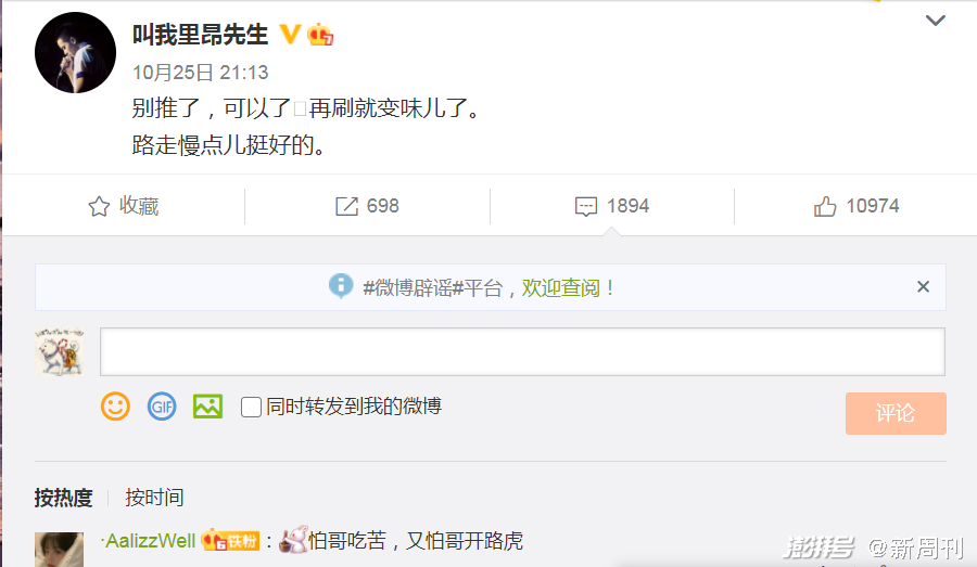10月25日,意识到歌开始火的柳爽发了条微博:“再刷就变味儿了。”有铁粉在下方回复:“怕哥吃苦,又怕哥开路虎。”