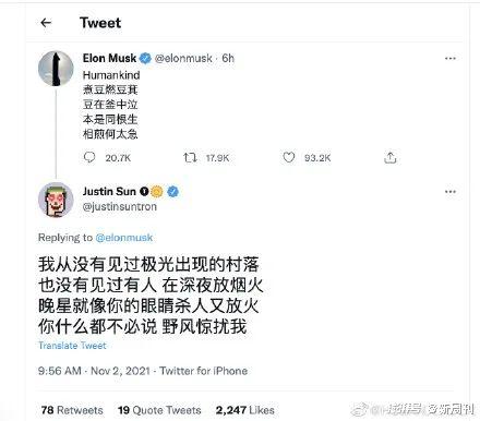 11月初,大洋彼岸的世界首富聊发诗狂,一首七步诗引发网友的无限猜想。不一会儿,“币圈传奇人物”孙宇晨用此歌歌词回复,生生将《漠河舞厅》“升格”成文化输出。此时再回过头来看,《漠河舞厅》的走红,有几分是因为真心感动?又有几分是大家都在玩梗?