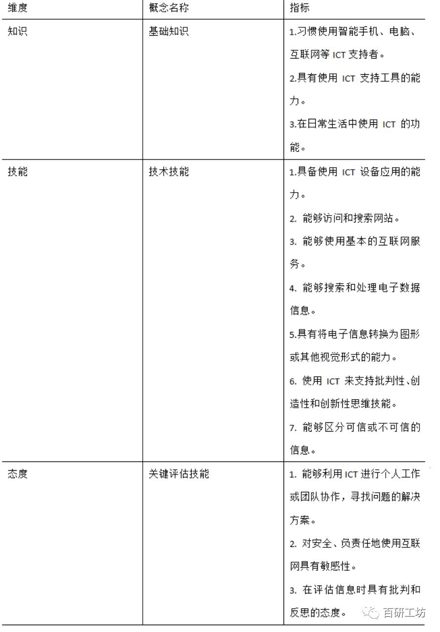 信息通信技术在教育界的发展所产生的强大影响,使得信息通信技术素养在各国的评估体系中得到了调整。澳大利亚是自 2005 年以来每三年发展一次 ICT 素养评估趋势的国家。根据 Pernia 在 中的 ICT 素养评估基于三个主要维度,即(a)了解技术知识,(b)相关知识 使用技术的技能,以及(c)从使用技术的反映中添加一种态度。表 1 更全面地提供了有关 ICT 素养评估的三个维度的信息。