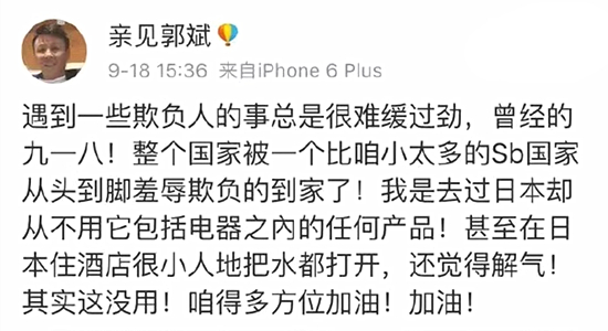 在九一八纪念日这天,郭斌发微博表示国人不应该再被羞辱欺负,并声称自己曾经在日本酒店把水都打开,还觉得解气。事后他删除了这一微博。