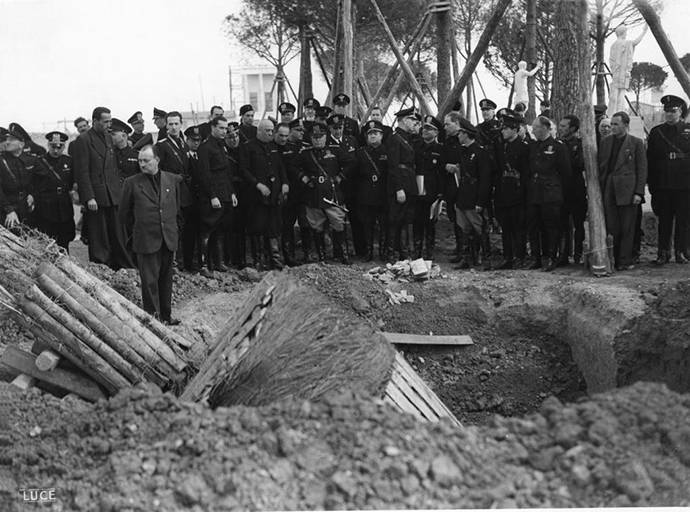 墨索里尼(中间叉腰者)移栽地中海松,为EUR工程开工剪彩。