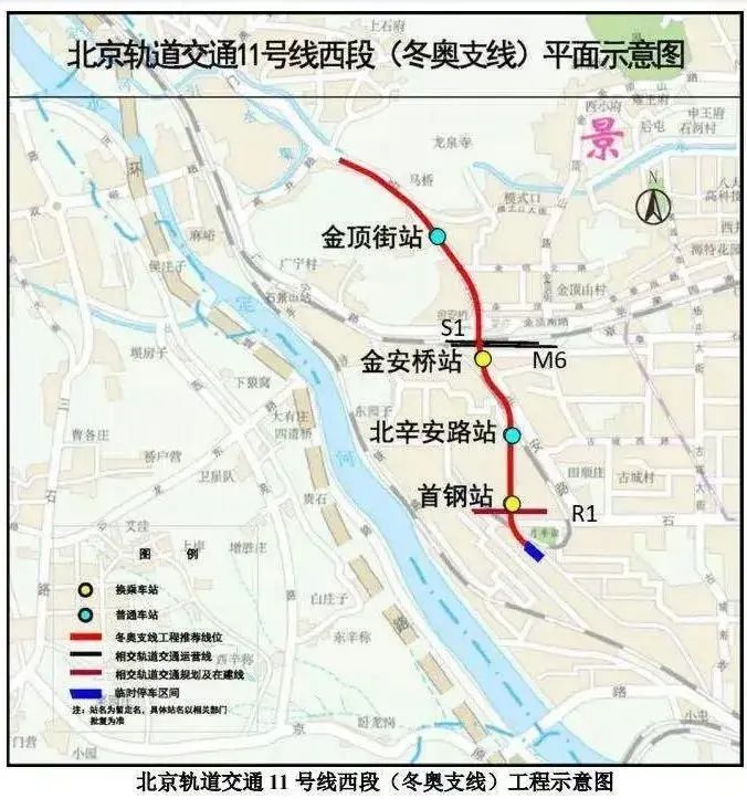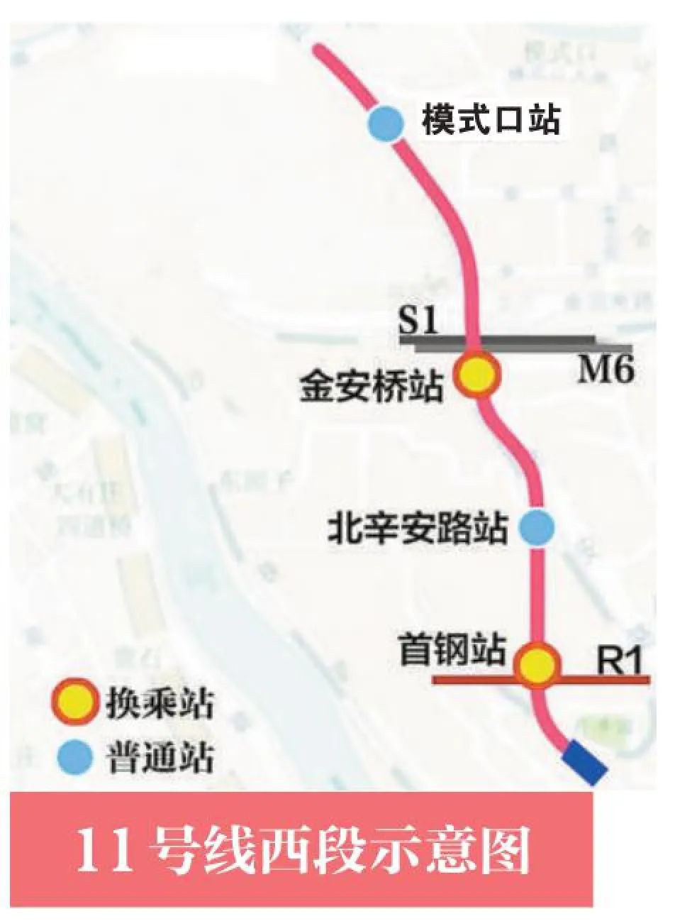 11号线西段(模式口站—首钢站)全长4公里,设站4座,在金安桥站与既有6号线、S1线换乘,在首钢站将与规划R1线换乘。该线将采用A型车、4辆编组,运行时速100公里。作为冬奥支线,11号线的车站和车厢内有丰富生动的冬奥元素。