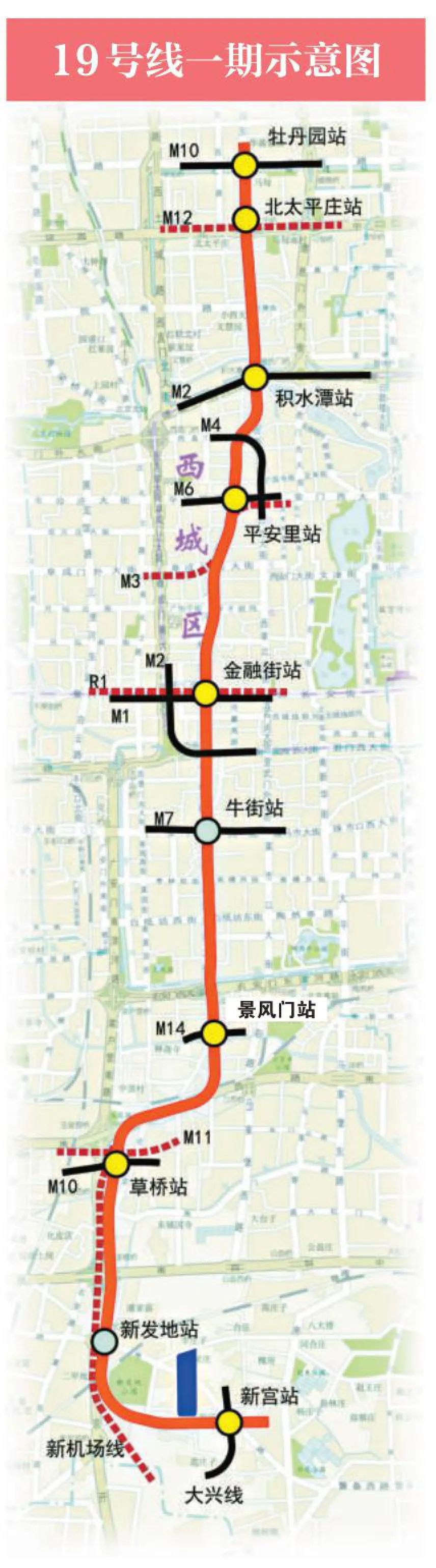 19号线一期:速度提升50%19号线是京城中部一条贯穿南北的动脉线,一期长22.4公里,设10座车站,除新发地站和牛街站,其余8站均为换乘站,分别与2号线、6号线、10号线等骨干线路换乘,特别是在草桥站可实现与大兴机场线换乘。19号线速度高、运量大,定员增加约60%,速度提升50%,乘客由新宫至金融街仅耗时15分钟,比目前乘坐4号线—大兴线节省约18分钟,预计对4号线—大兴线南段分流10%左右。同时,牡丹园至草桥可缩短30分钟。
