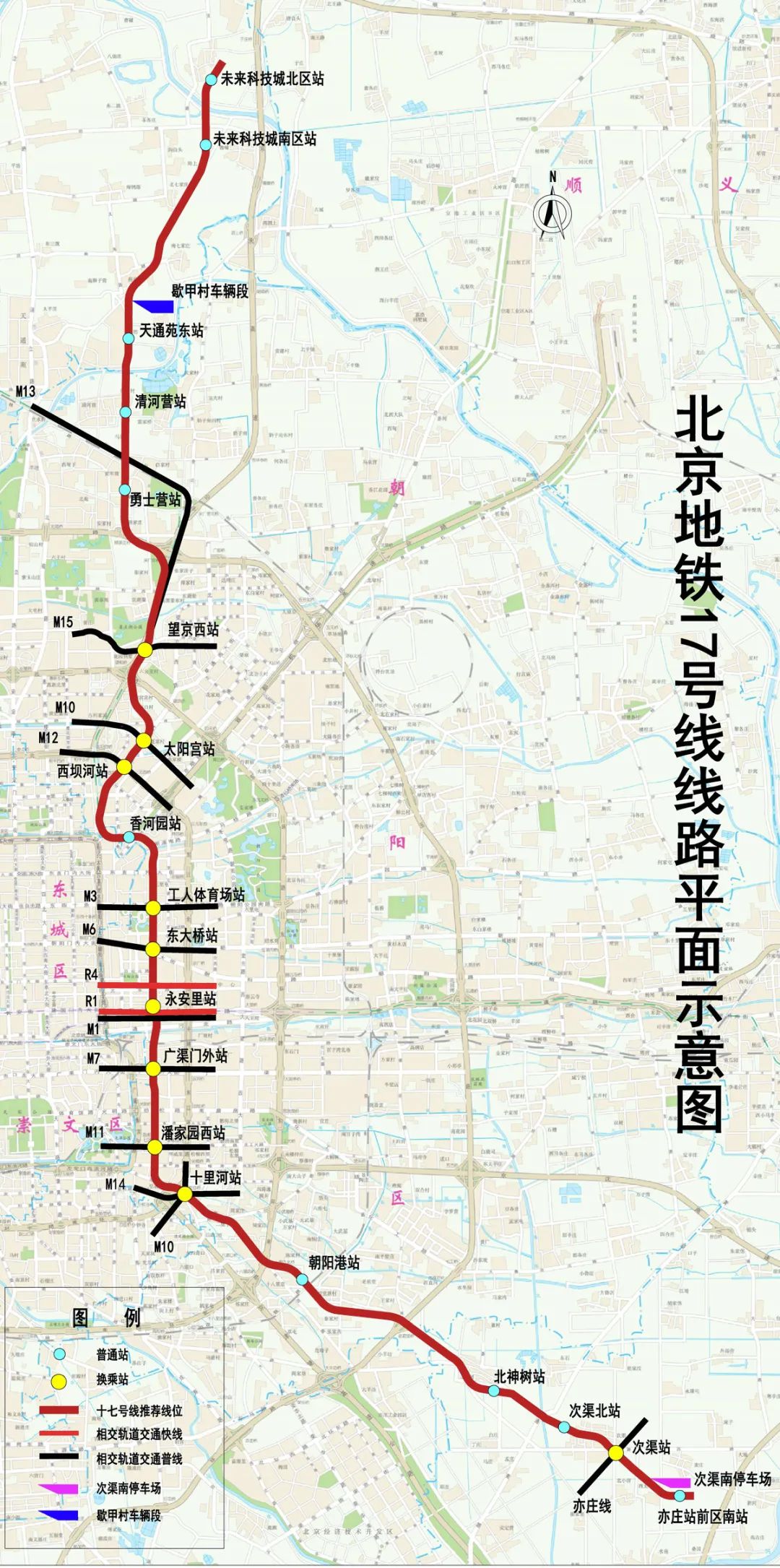 17号线南段:亦庄直达东三环17号线是条位于东部地区贯穿南北的骨干线路,年底计划开通的南段从十里河至亦庄站前区南,全长16.5公里,设7座车站,其中次渠站与亦庄线换乘、十里河站与10号线、14号线换乘。17号线为8A编组列车、全自动运行线路,最高运行时速100公里,也将是一条全路网载客容量大的快线。开通后,次渠地区至十里河乘车出行时间将缩短10分钟。