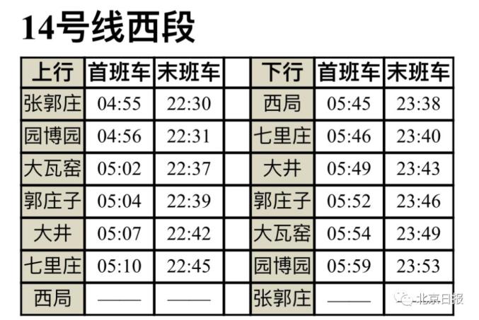 随着14号线启动贯通跑图试运行,各站首末班车时间也有所调整,既有段14号线西段和东段全天运营时间增长,让地铁出行更加灵活、便民。其中:14号线西段张郭庄站至西局站方向各站首班车发车时间提前了35分钟,末班车发车时间延后了20分钟;西局站至张郭庄站方向各站末班车发车时间延后了1小时28分钟。