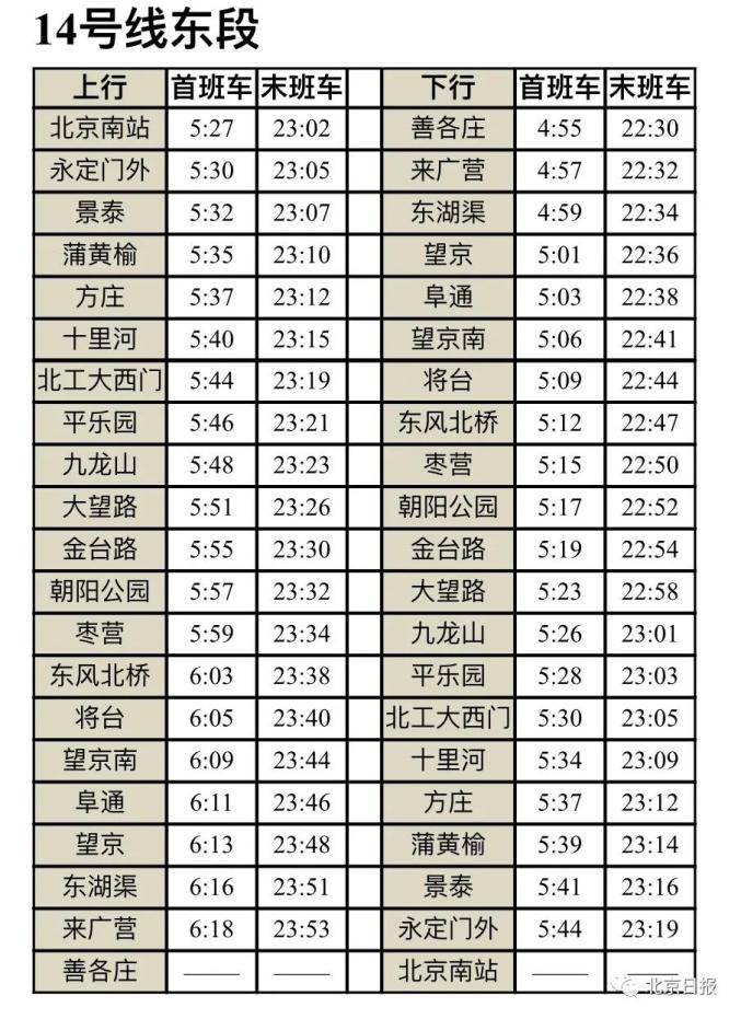 14号线东段北京南站至善各庄站方向各站首班车发车时间提前了3分钟,末班车发车时间延后了22分钟;善各庄站至北京南站各站首班车发车时间提前了5分钟。