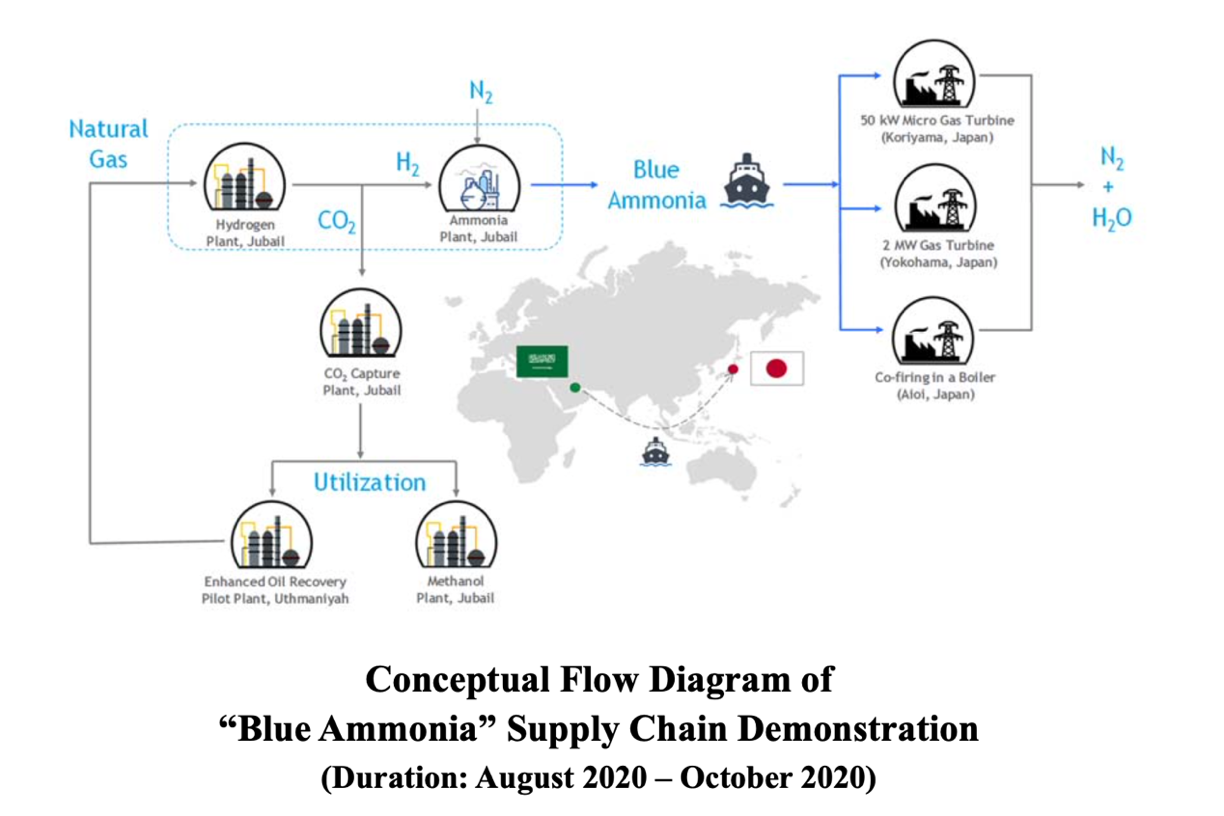 同时,阿美公司着眼蓝氨研发,并将蓝氨生产过程中的二氧化碳捕获重用。2020年9月,阿美公司和日本能源经济研究所(the Institution of Energy Economics, Japan)以及沙特基础工业公司(Saudi Basic Industry Corporation, SABIC)合作,在日本产业经济省的支持下,建成世界上第一个蓝氨供应链示范,[11]从沙特生产40吨高品位蓝氨,运输至日本用于零碳发电。[12]并在此过程中,捕获50吨二氧化碳,其中30吨用于沙特基础工业公司伊本·西那(Ibn-Sina)工厂的甲醇生产,另外20 吨用于阿美公司乌斯马尼亚('Uthmaniyah)油田提高石油采收率。[13]