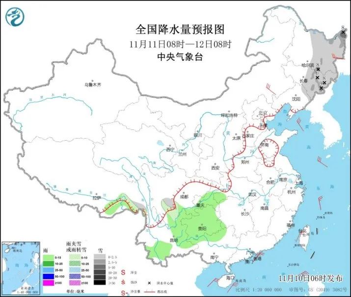 11月11日08时至12日08时,东北地区中东部等地有小到中雪、局地大雪(5~9毫米)。云南东部和南部、四川南部、重庆、贵州大部等地有小雨或雨夹雪。内蒙古东部、东北地区东部等地的部分地区有4~6级风。