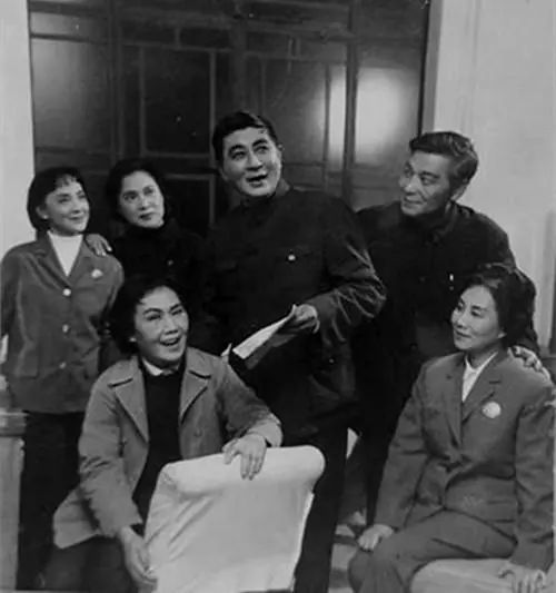赵丹、白杨、王丹凤、秦怡、温锡莹、孙景路一起排练诗朗诵《中南海的明灯》
