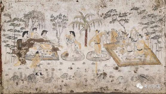 这组人物左端补绘一跪坐的男歌者,右端补绘一站立的男子,前部方毯上置一筝。这些男子多为胡人形象。在人物背后,绘有多种树木和修竹,前部绘花草和景石。