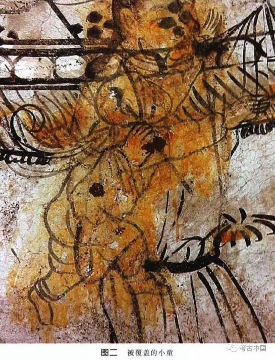 在盗墓者2005年拍摄的一幅照片中,这个细节更为明显。原绘于左部方毯之前向右奔跑的小童右手抬起并前指,恰与这只兔子相呼应(图二)。