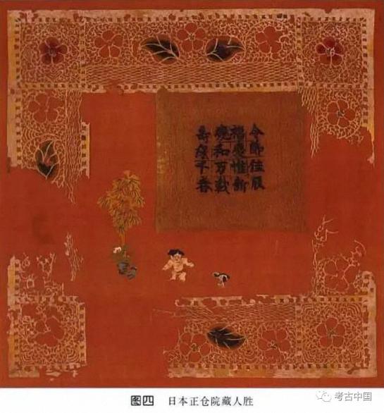 这类儿童与动物嬉戏的例子,还有新疆吐鲁番阿斯塔那M187出土唐残屏风(图三)以及日本奈良正仓院藏天平宝字元年(757年)润八月廿四日献物中“人胜”所见小童与拂菻狗的形象(图四)。从这个细节入手,可以对乐舞图壁画绘制的过程进行细致的分解。