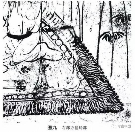 我们再来进一步分析“五期”的关系。如上所述,右部方毯前缘处的筝为后补,右端站立的男子也是后画的,那么,方毯在绘制时,其前部既没有筝也没有站立的男子,而是一块多余的空白。