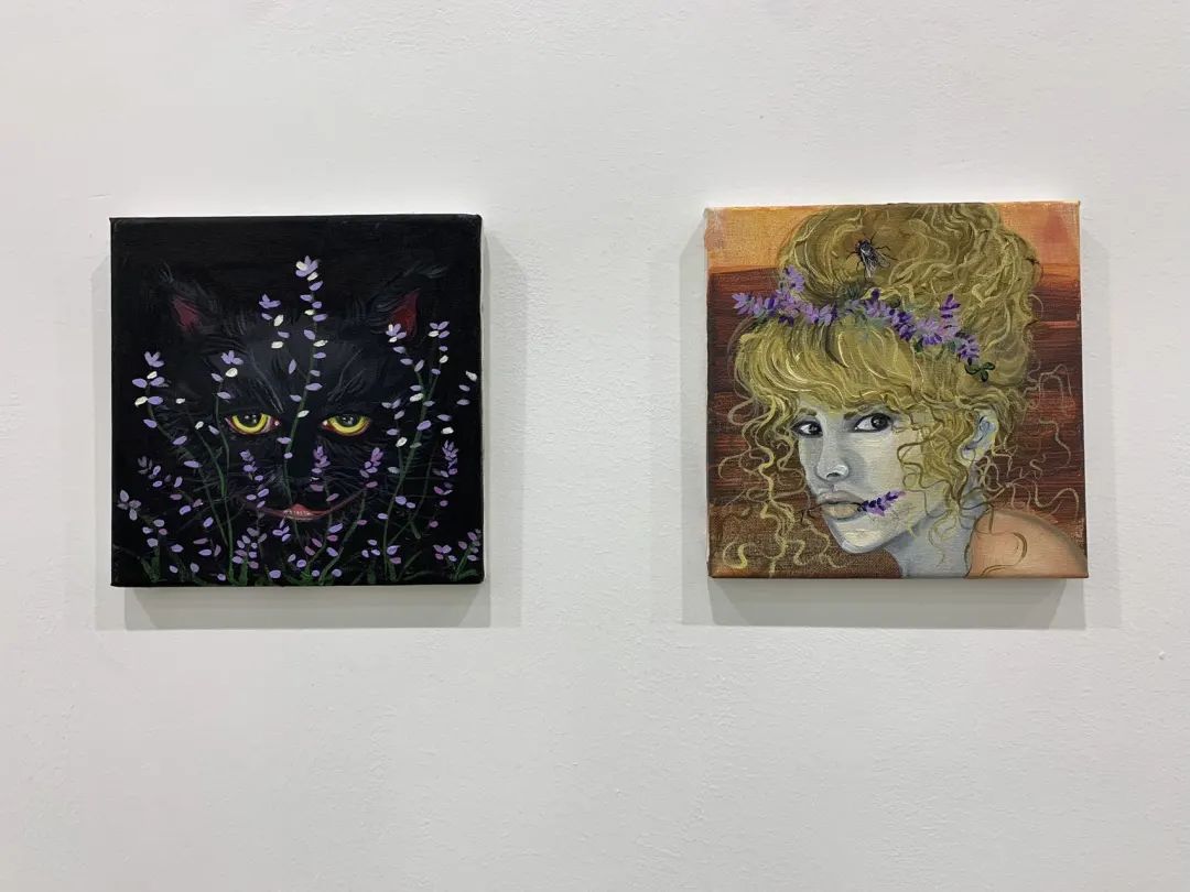 卡佳·赛博 戴着薰衣草和苍蝇的女孩 2021 布面油画及丙烯 20.4*20.5*1.7cm卡佳·赛博 猫和薰衣草 2021 布面油画及丙烯 20.4*20.5*1.7cm
