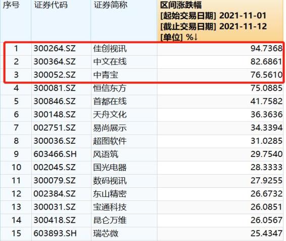 据虎嗅统计,仅11月1日至12日收盘,A股85只元宇宙概念股(wind统计)只有4只股价下跌,涨幅超过25%的有15只,超过30%的有8只,有4支甚至已超过70%。