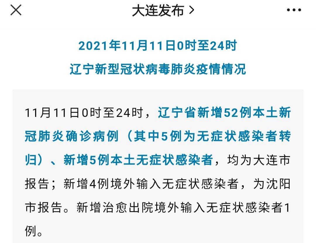 11月11日0时至24时,辽宁省新增52例本土新冠肺炎确诊病例、新增5例本土无症状感染者,均为大连市报告。