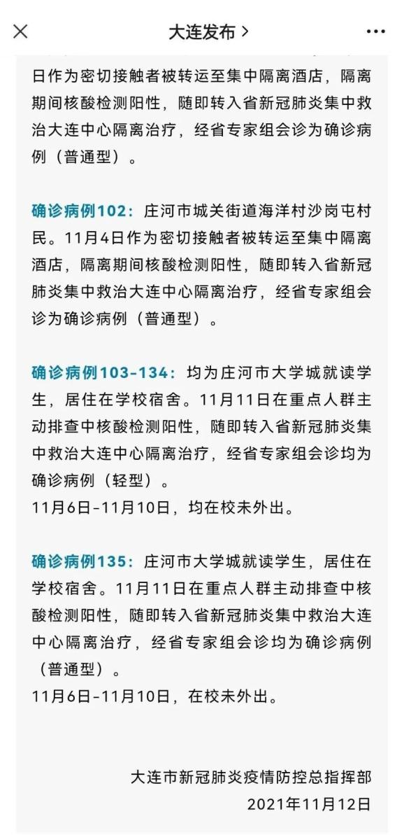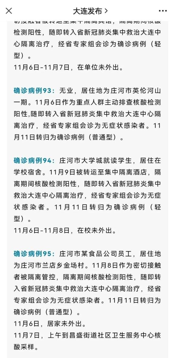 其中,4位确诊病例均在庄河市某大学食堂工作;确诊病例97为庄河市大学城员工,居住在学校宿舍。