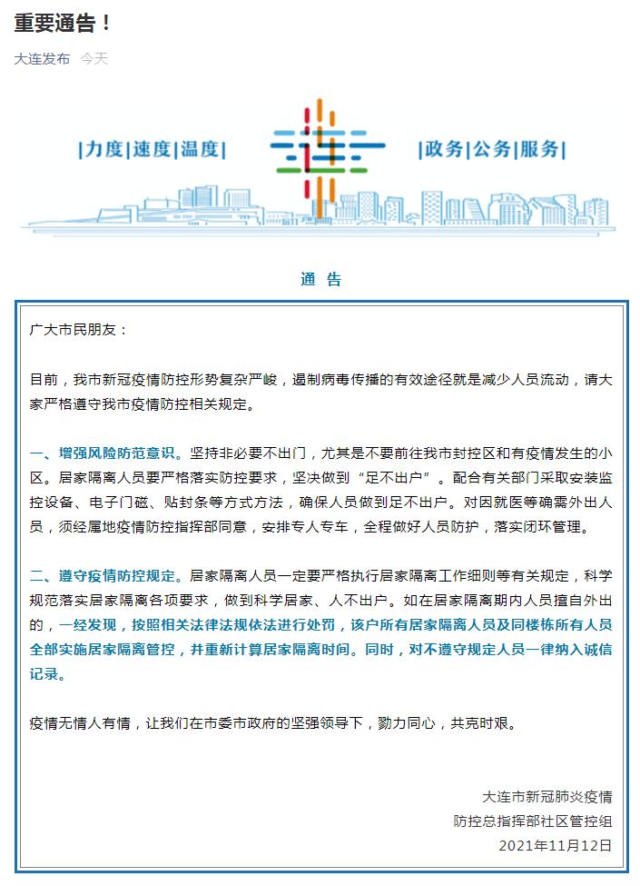 11月12日,“大连发布”微信公众号发布消息,为应对疫情,要求居家隔离人员一定要严格执行居家隔离工作细则等有关规定,做到科学居家、人不出户。