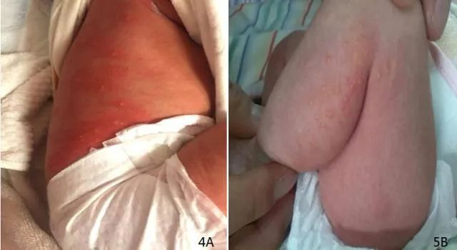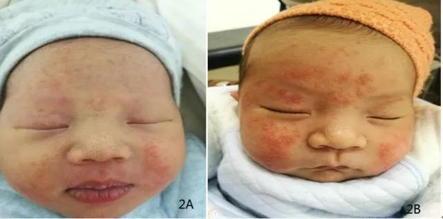 通常在出生后 3 日发病,病程 7~10 天,好发于面部、躯干、四肢近端,不累及掌跖。皮损形态多样,可见红斑;红斑中央黄色、白色丘疹风团或水疱、脓疱,皮损数量数个至数百个不等。