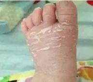 新生儿在出生后,往往出现脚踝、脚底及手腕皮肤干燥粗糙,从而出现脱皮的现象。这是因为刚出生的婴儿皮肤最表面的角质层太薄,表皮和真皮之间连接得也不紧密,所以出现了脱皮现象。通常在第8天最严重,随后逐渐减轻。