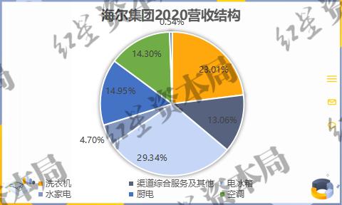 成立之初,海尔以冰箱为主要业务。1993年上市后,开始拓展新产品,目前在冰箱、洗衣机、酒柜、冷柜等产品市场占有率较高。据公司2020年财报,从企业营收结构来看,目前电冰箱、洗衣机为企业收入最主要的来源,占总营收比超50%。