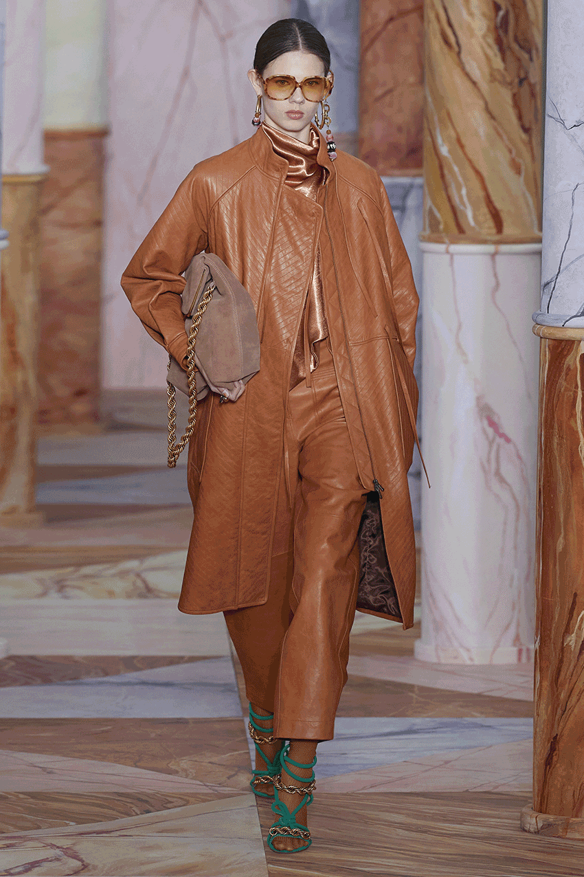如今三年过去,新BV风格的模仿者在时装市场遍地开花,而标志性的皮裤自然也不会被放过。宽松大气、色彩典雅的皮裤甚至皮革套装越来越多地出现在秀场上,成了职业女性的时髦通勤装束。