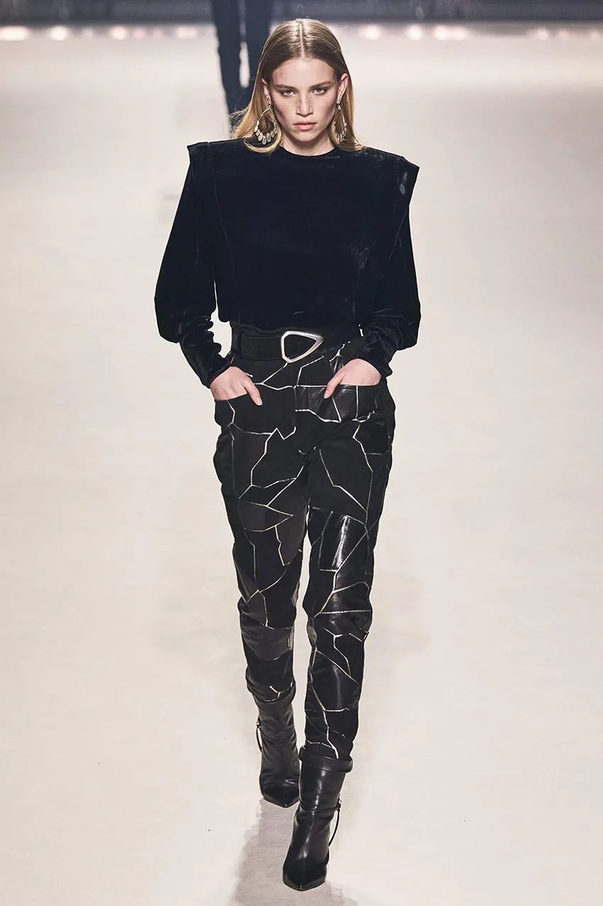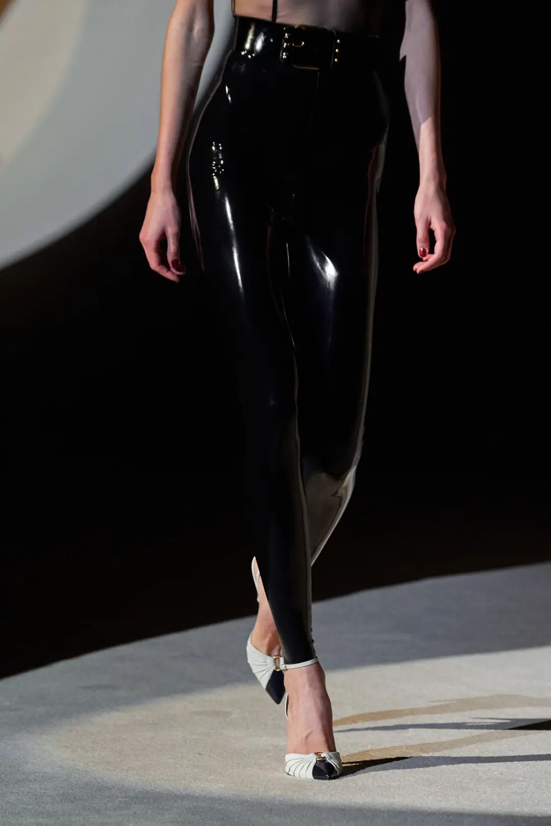 Saint Laurent 2020秋冬系列秀场上,一大半模特都身穿类似的漆皮legging出场,将夜间巴黎女郎的优雅、锋利、性感体现得淋漓尽致