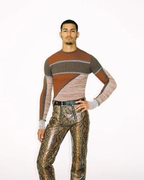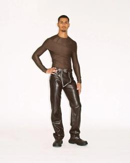 即便在皮裤重又流行起来的今天,它对于女性和男性也有完全不同的意义:同样搭配得简洁干净的情况下,女人穿皮裤,似乎是被赋予了力量感,人们会认为她是白领、高管之类的职业女性;但男人穿皮裤,人们还是会觉得奇怪。